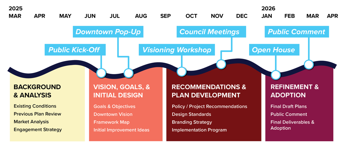Phase II kicked off in March 2025, beginning with gathering background information on downtown and analyzing existing conditions. There are several opportunities to get involved as the project moves through its remaining phases: Vision, Goals, & Initial Design; Recommendations & Plan Development; and Refinement and Adoption. The plan is set to be complete by April 2026. Find out how to get involved on the Engage page, or leave us a comment directly!